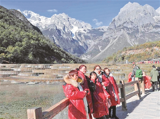 丽江玉龙雪山蓝月谷以雄奇壮美的雪山、湛蓝的湖水和秀丽的峡谷风光吸引着八方游客前来游览观光。(记者 杨宗友 摄)