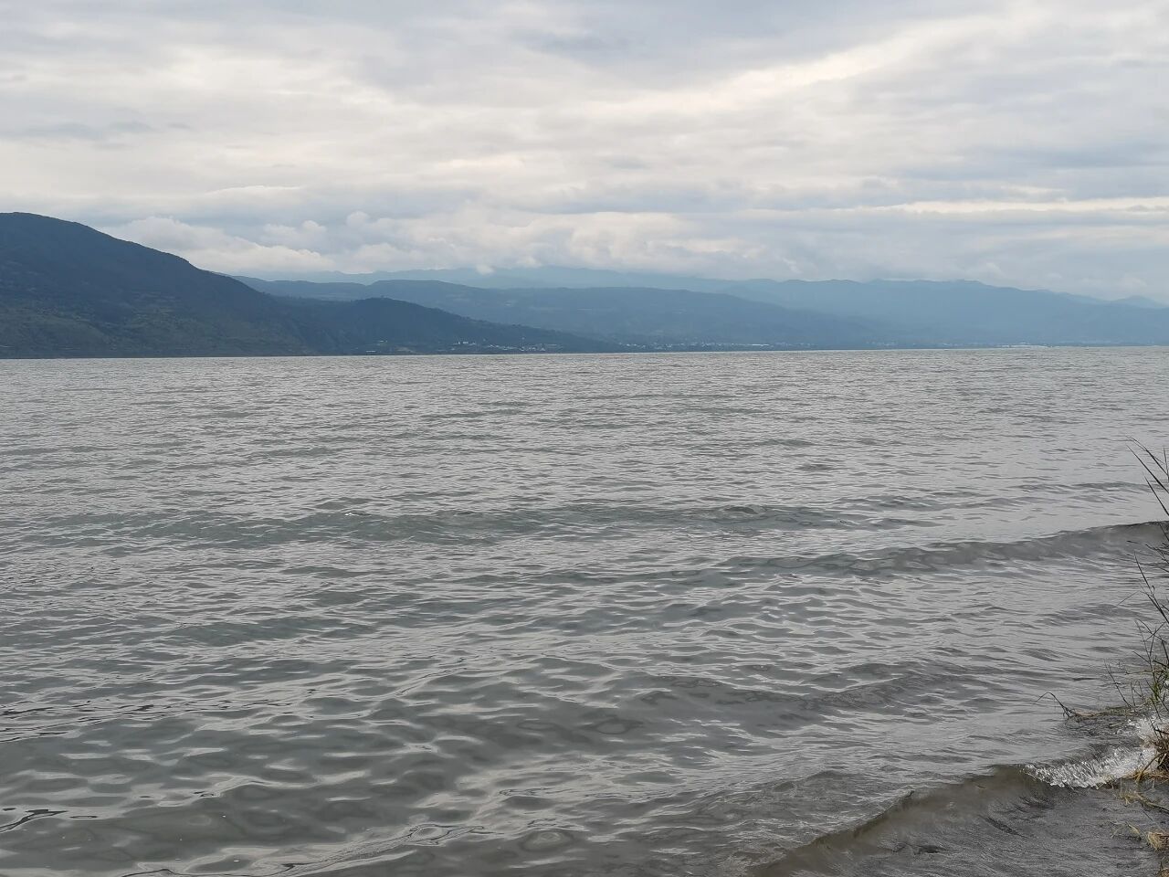 随着水位上涨,以往游人漫步的沙滩已被湖水淹没,岸边的草木与标尺也没入水中。清澈的湖水轻拍湖岸,重现往日湖光潋滟的景象。
