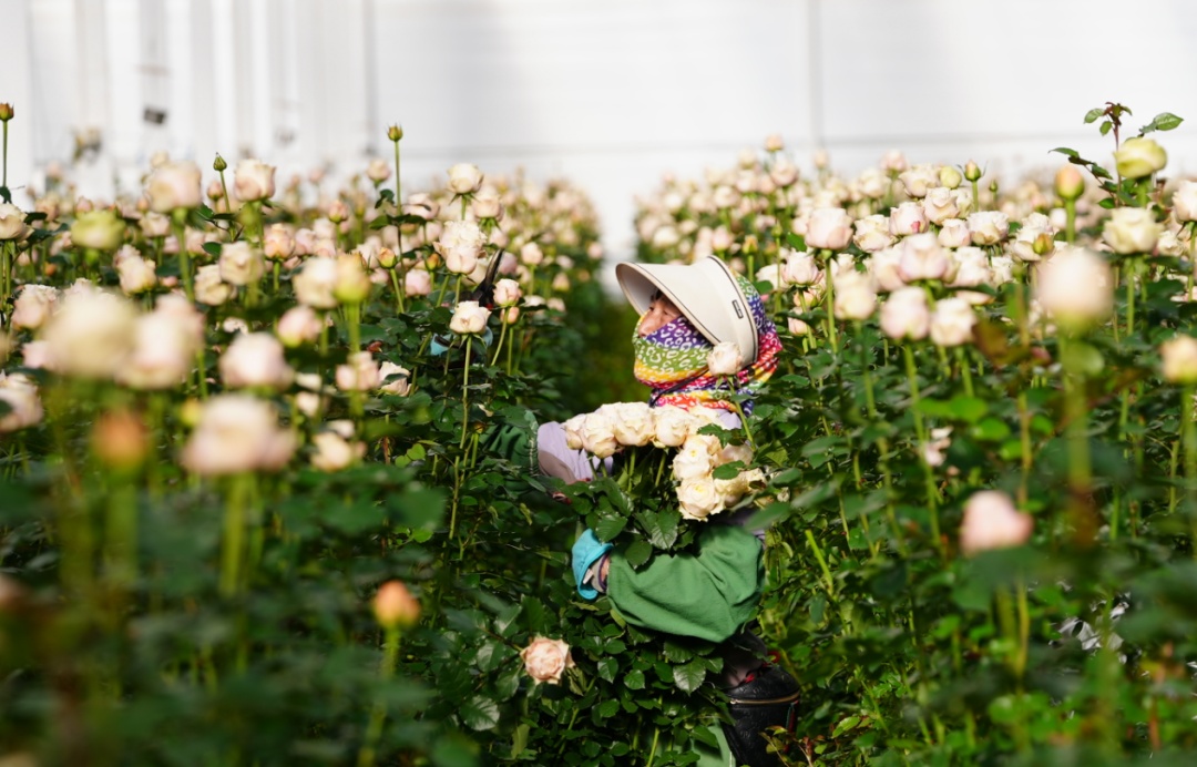 这座占地1100亩的花卉产业园,建有35万平方米的智能温室,种植着48个玫瑰品种和18个彩色马蹄莲品种。自2020年8月投产以来,产业园的鲜花销售总量已突破1亿枝。产业的发展不仅让“丽花”香飘海外,更成为富民增收的重要动力。周边村民通过土地流转,在园区务工获得了稳定收入,年底还能参与集体经济分红。