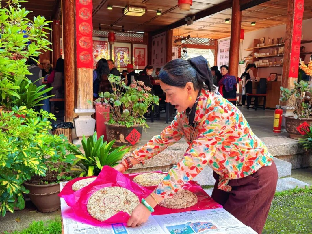 活动现场,大家欢聚一堂,跟随纳西阿妈学习制作传统月饼。纳西阿妈现场演示了和面、包馅等步骤,将核桃、紫苏、薄荷等特色馅料裹入面团中,压制成饼状。随后,大家纷纷动手参与,撒芝麻、填核桃仁、印花纹,亲手制作属于自己的中秋味道。月饼经过炭火烘烤后香气四溢,弥漫在整个院落。众人纷纷拿起手机,记录下这温馨美好的时刻。