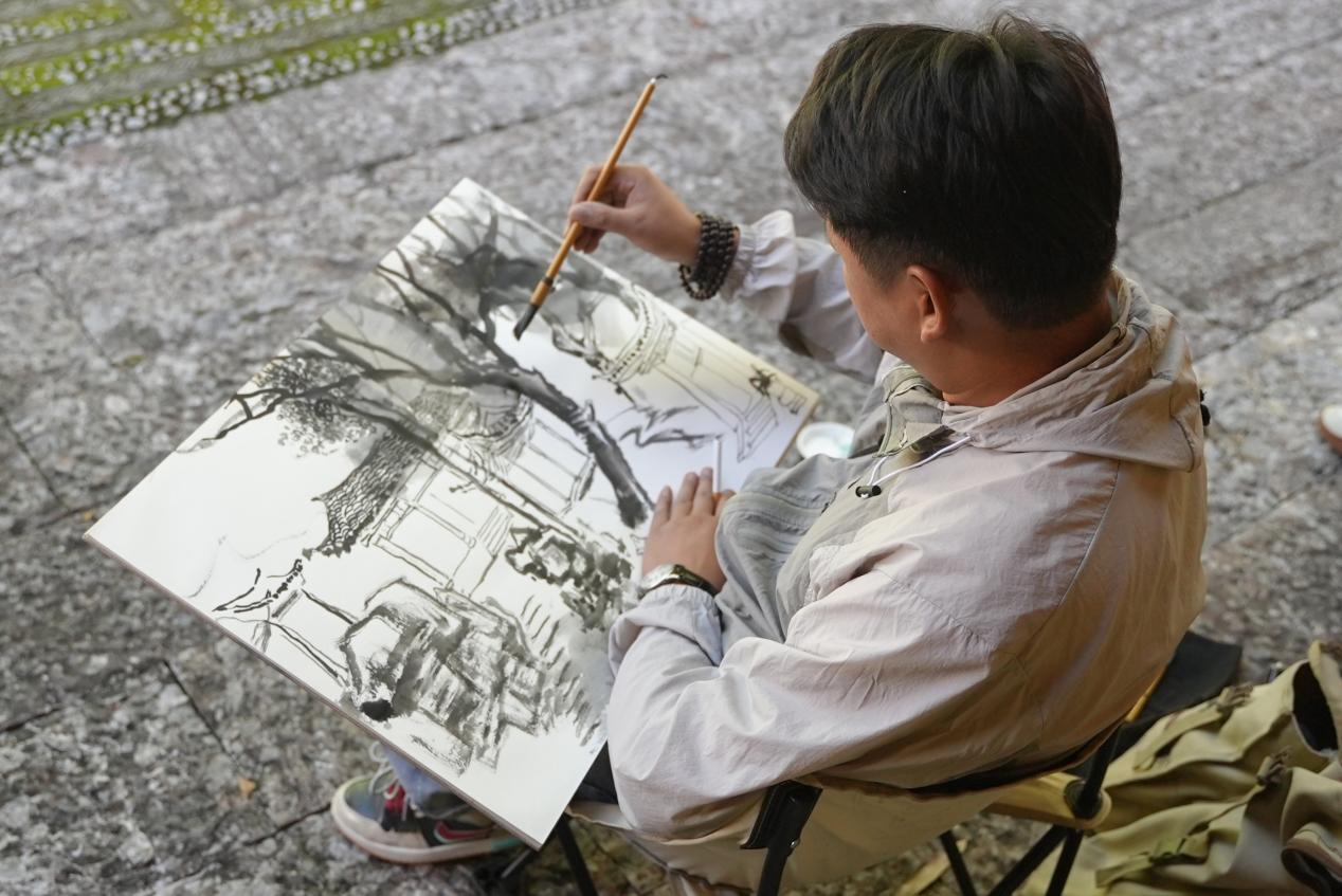 在黑龙潭的写生现场,中国艺术研究院博士、李可染画院终身研究员聂松教授的创作方式独树一帜。与其他画家不同,他始终使用极浅的淡墨作画,画面如薄雾轻笼,却层次分明,墨色具有亲和力。淡墨看似简单,实则需要深厚的功底支撑。聂松解释道:“这需要从书法开始积累手上力道。下笔时墨虽淡,但要力透纸背。”在他的笔下,远山近水、亭台树木,皆以极其精微的墨色变化展现,仿佛将丽江的灵秀之气轻拢慢捻,化作纸上烟云。