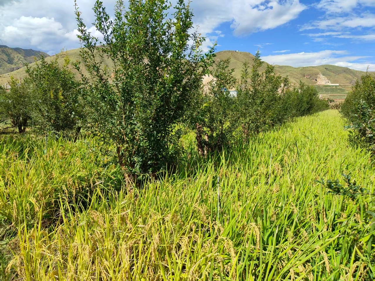 今年,涛源镇在涛源村委会涛西村实施3亩旱地优质稻适应性鉴定试验,选用“旱优73”品种,创新采用石榴—旱稻套种模式。该模式充分利用石榴生长前期树冠稀疏、遮荫少的特点,在行间同步种植旱稻,既实现了土地、光照与水肥资源的高效利用,形成“一地双收”的良性循环,又通过高矮作物搭配有效抑制杂草,显著提升单位面积综合效益。