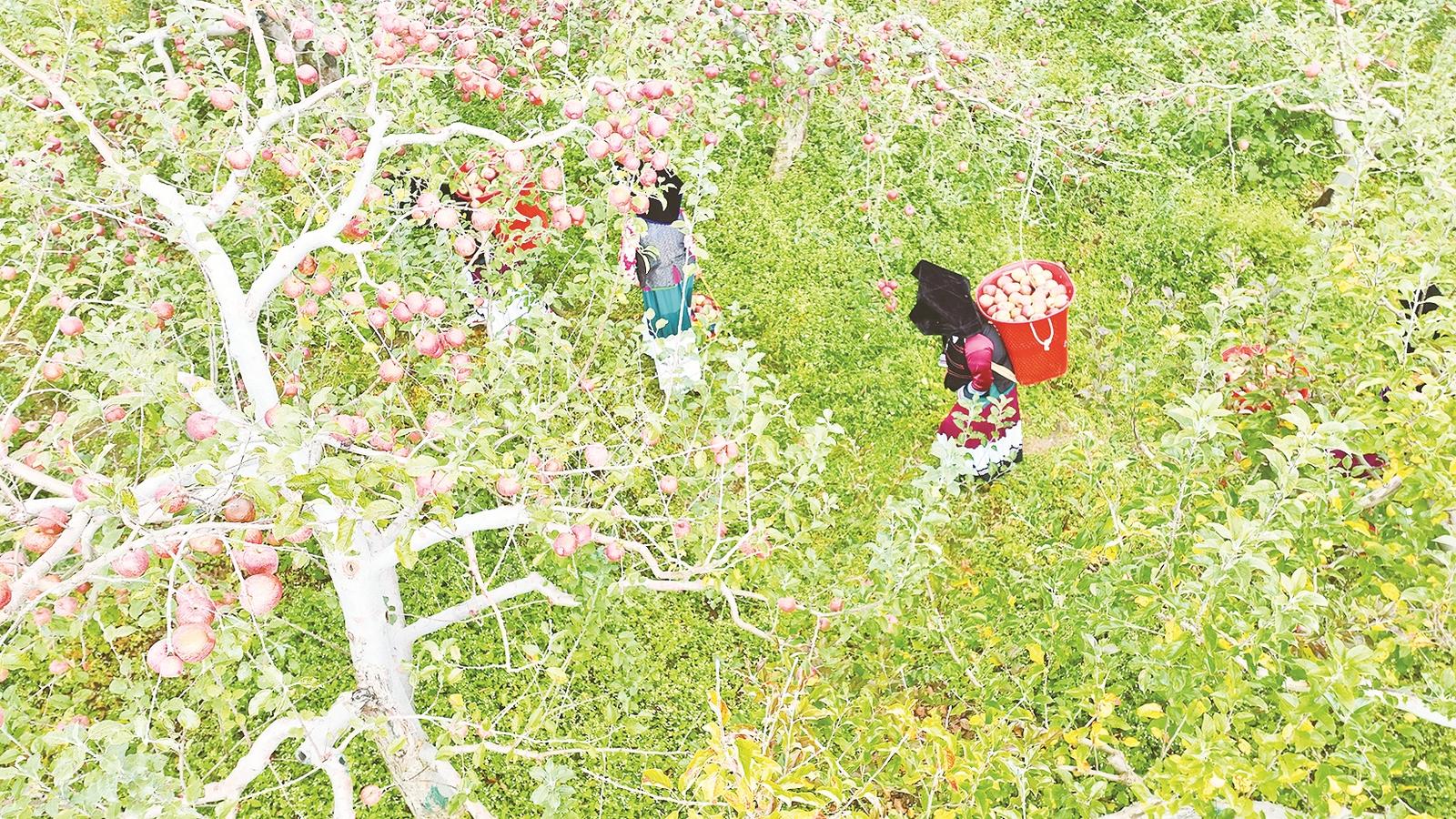 在新营盘乡毛家乡村,果农沙长发的57亩苹果园里一片繁忙。今年,他家果园中有30多亩进入丰产期,结出的苹果个头大、糖分足,刚采摘就被外地客商订了大半。“按照市场价,预计收入50万元左右。” 沙长发向记者算起了收益,脸上满是丰收的喜悦。