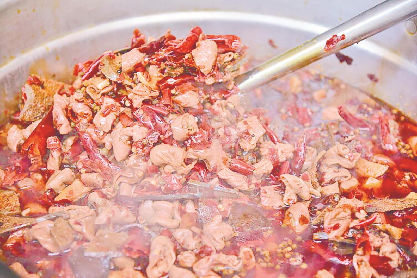“猪肝渣是这道菜的灵魂,它让各种味道更好地融合。”和学清说,这种秘制的风味酱料,让辣味、鲜味与酱香在高温中充分交融。随后小火慢炖,待猪肠五六成熟时,依次加入其他配料,让每种食材在辣味汤汁中慢慢浸润。