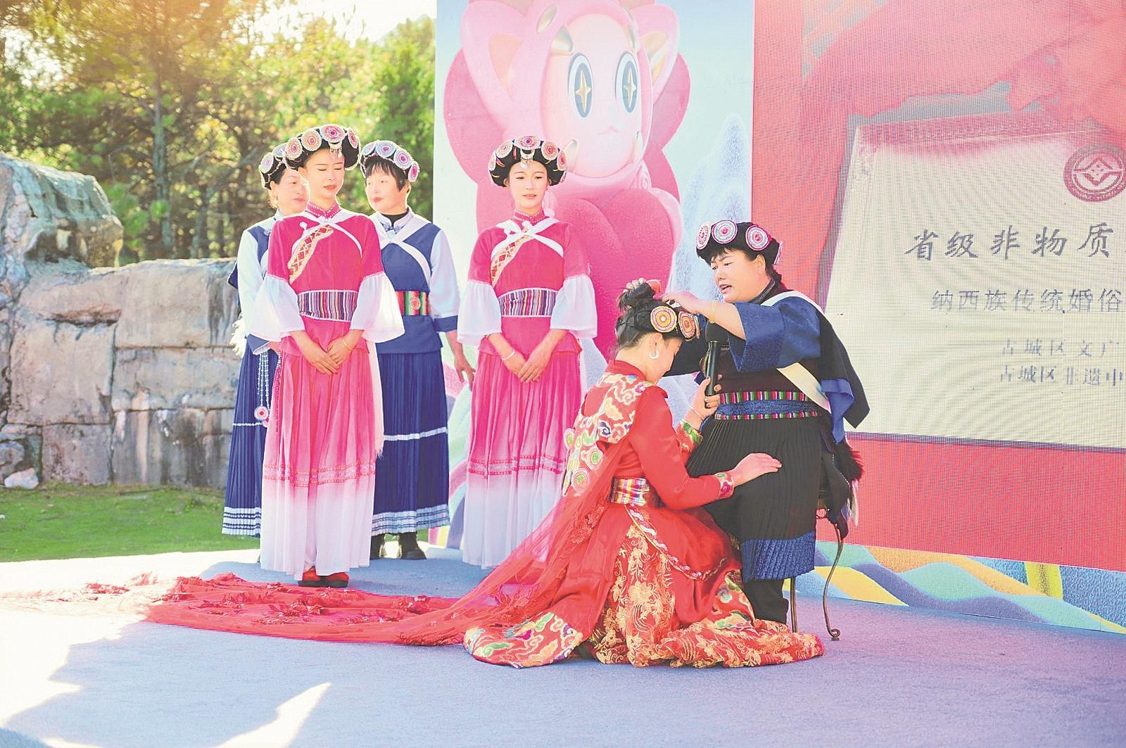 东巴祭司的祈福仪式庄重而神圣,纳西阿妈的《嫁女调》真情流露……活动现场,一场传统的婚俗展演,将纳西族的浪漫娓娓道来。