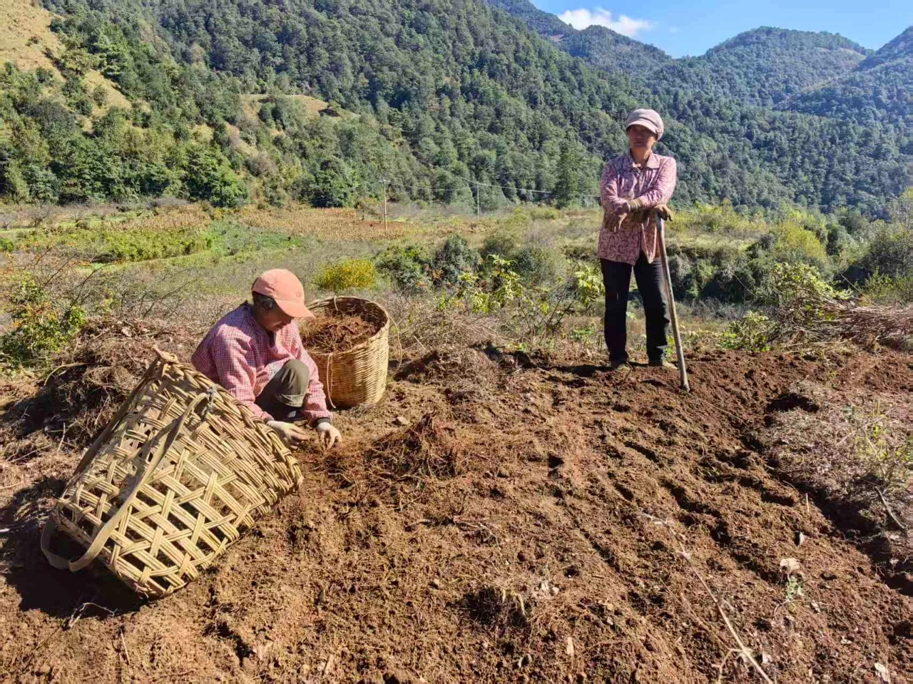 初冬时节,永胜县松坪乡松坪村委会的山林坡地间,村民们正趁着晴好天气,采挖酝酿了一年的“金疙瘩”——草乌。空气中药香淡淡,笑意融融,一幅产业兴、百姓富的和美乡村画卷,正在这片土地上生动铺展。