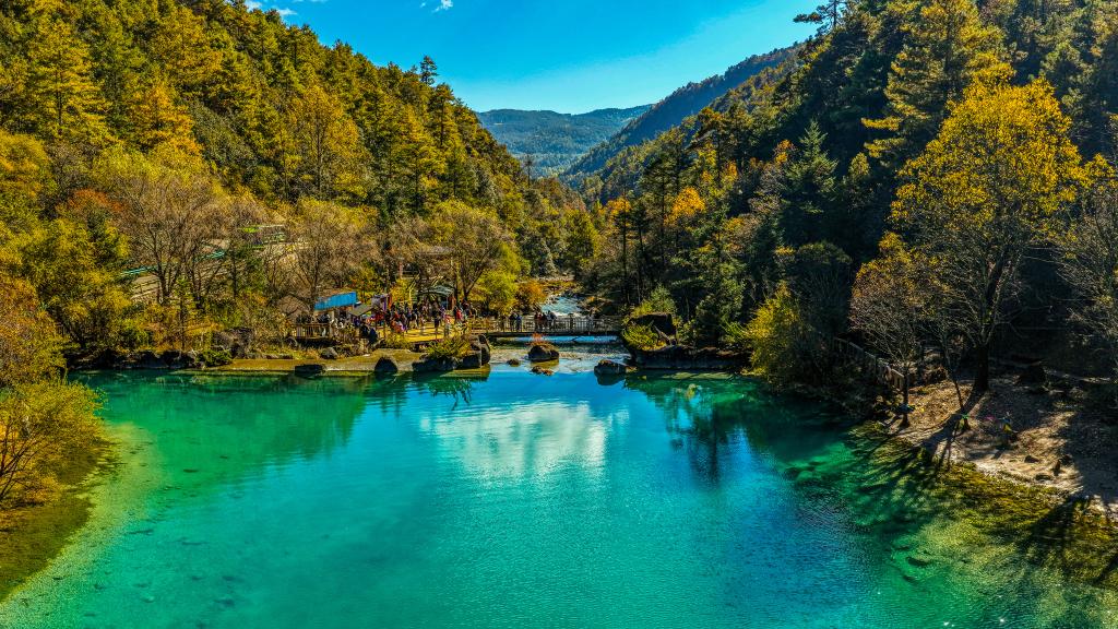 被誉为“小九寨”的蓝月谷,湖水呈现梦幻的碧蓝色,四周环绕着金黄、火红的多色树林。