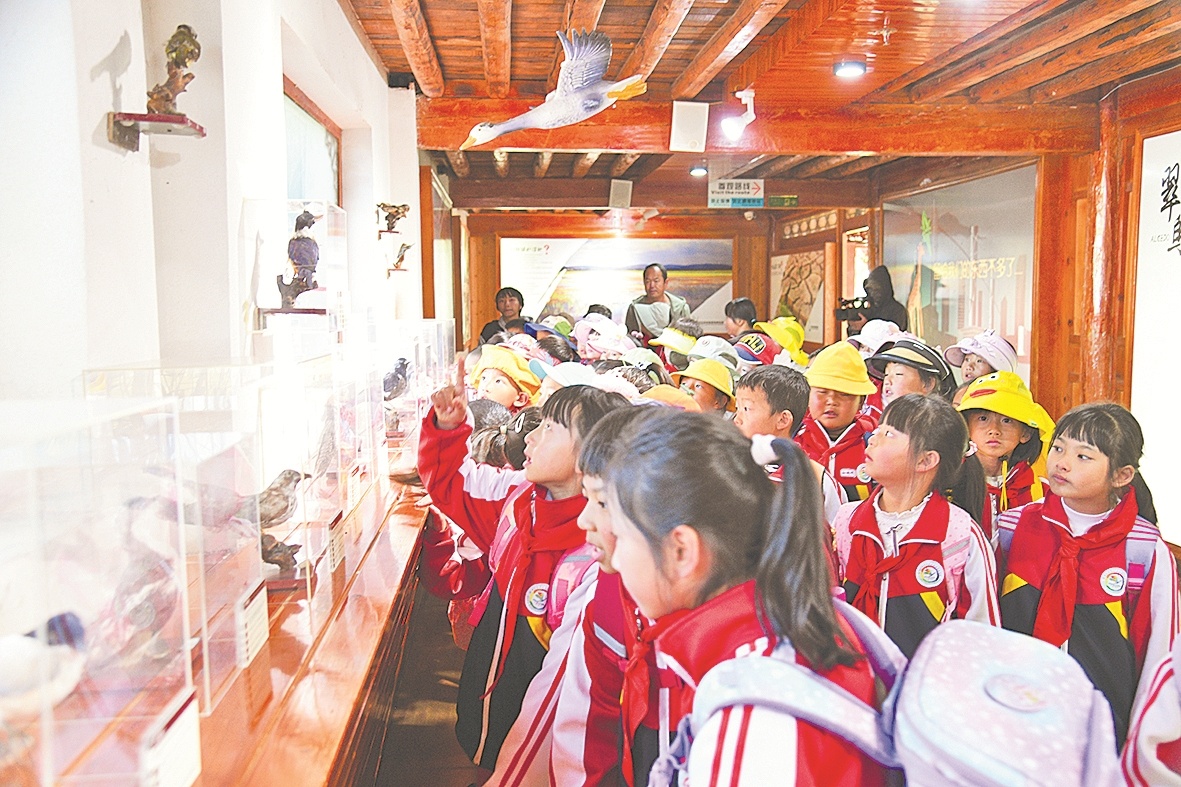 11月14日,市实验学校学生在拉市海湿地博物馆观看候鸟标本。 见习记者 和丽菊 摄