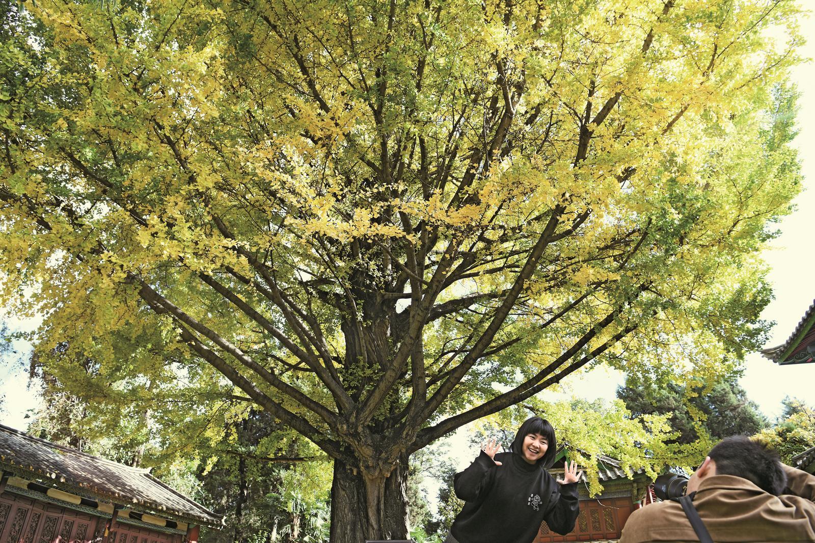 近日,游人在银杏树下拍照游玩。