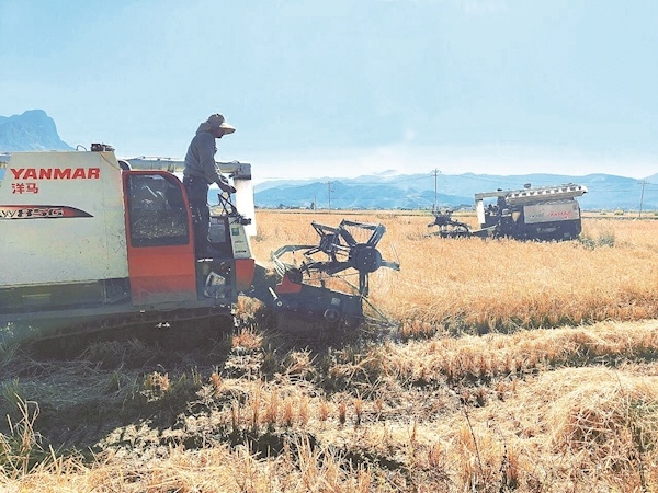 近日,伴随着收割机的阵阵轰鸣,宁蒗县永宁镇有机高原红米基地完成了全机械化收割作业,这标志着永宁镇高原红米产业发展迈入规模化、机械化新阶段。