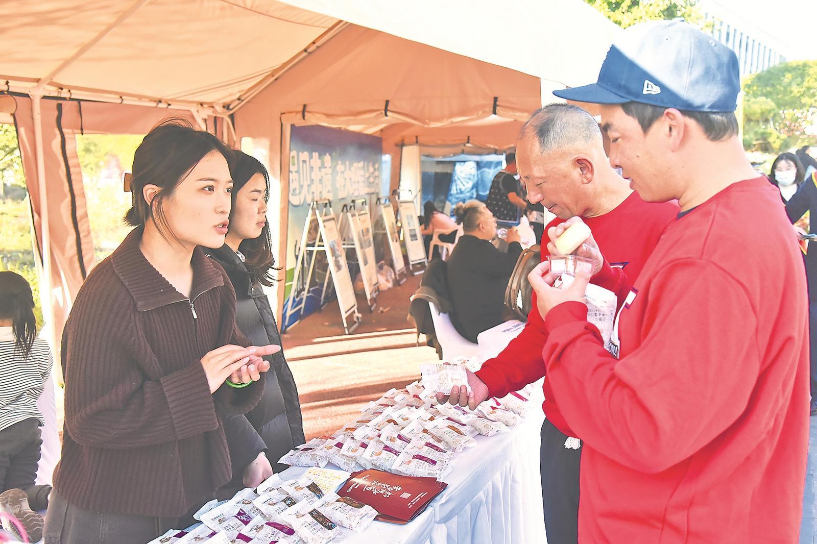 11月29日,2025/2026富滇银行云南省城市足球联赛开赛当天,汇聚了云南16个州(市)的特色展区——“玉见”主题集市人头攒动,热闹非凡,成为一道亮丽的风景线。丽江展区凭借特色美食和文创产品成为亮点。图为球迷在了解永胜水酥饼。 (记者 和玉松 摄)