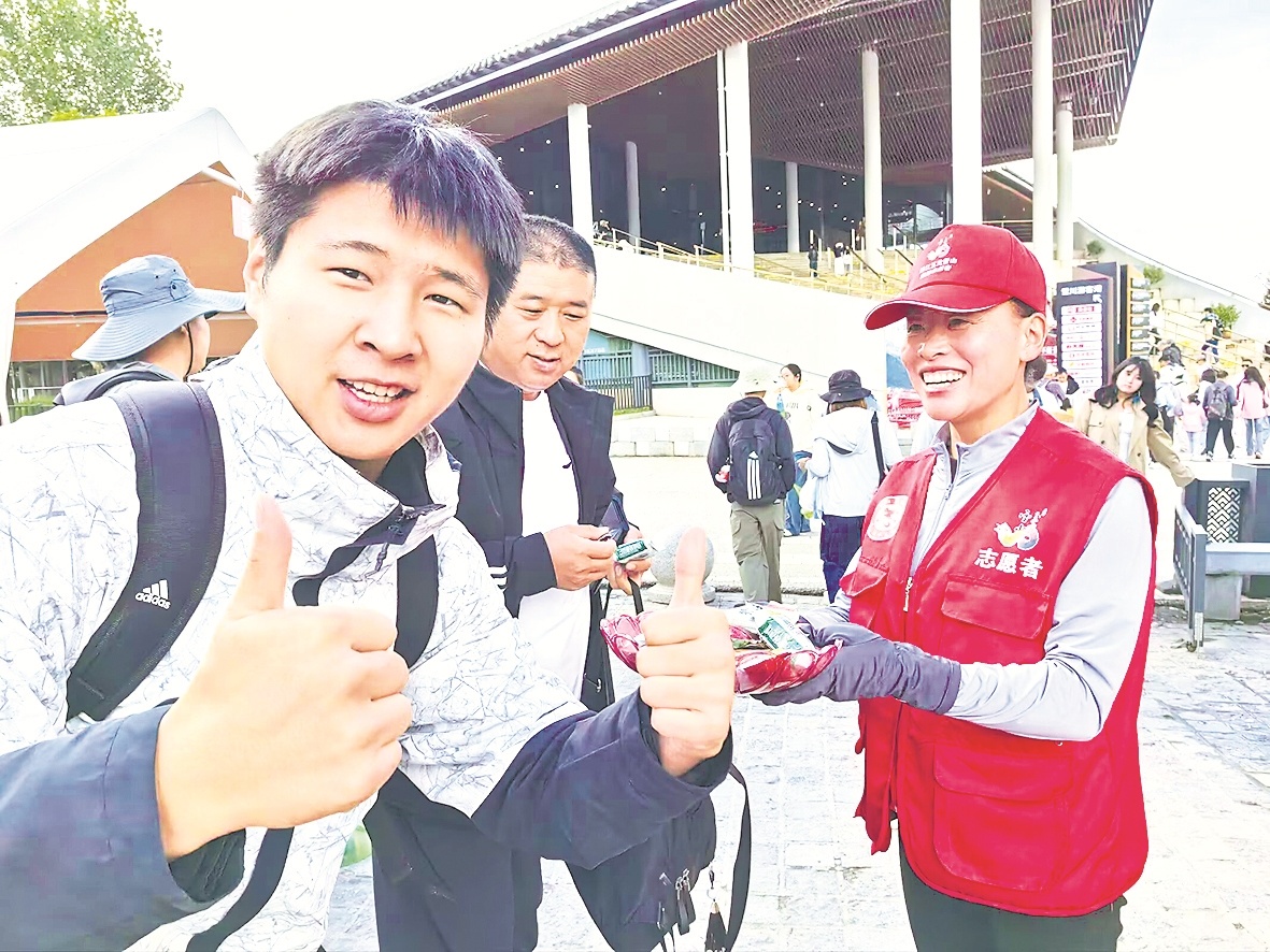 志愿者在景区停车场提供暖心服务,获游客点赞。 通讯员 唐健恒 摄