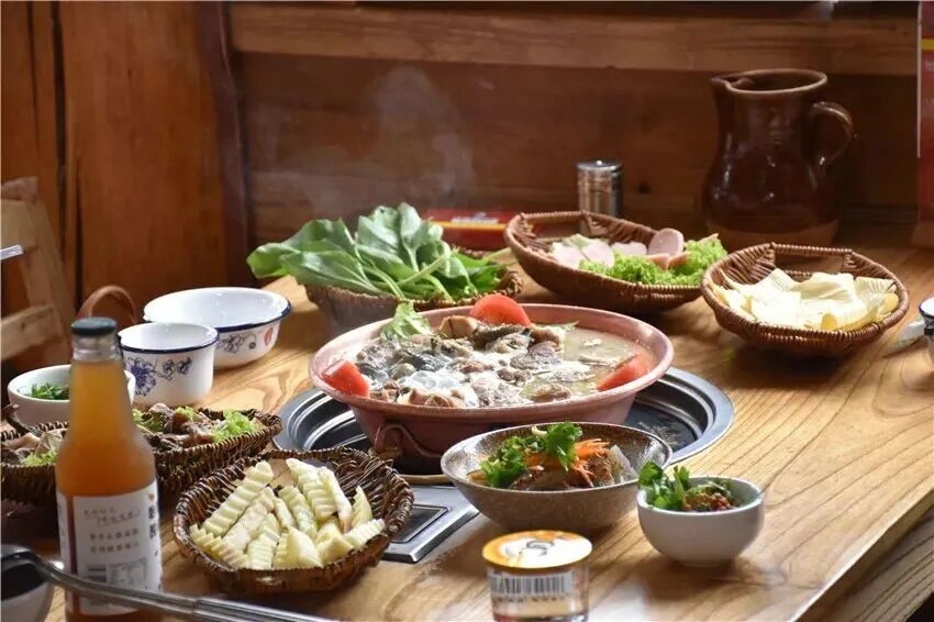 这份饮食的默契,在两地的经典菜肴中便可窥见。文山有酸香扑鼻的岜夯鸡,丽江便有酸辣醇厚的酸辣鱼,二者皆以劲爽酸汤为基,鲜爽开胃。文山的三七汽锅鸡名列“十大滇菜”,丽江的腊排骨火锅同样声名远扬——农家土猪排骨经古法腌制、风干,慢炖后肉质松软不柴,腊香与鲜嫩交织,搭配纳西特制蘸水,风味醇厚。这道菜曾是纳西族节庆宴客的珍品,如今已成为游客必尝的风味美食。此外,丽江的黑山羊火锅也是冬日暖身佳选,高原黑山羊肉质紧实不膻,搭配温补汤底,一口下肚,暖意顿生,既解馋又养身。