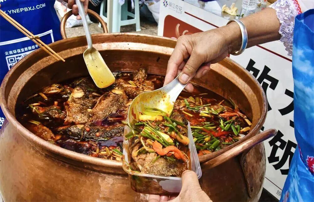 拉市酸辣鱼:丽江特色招牌。以鲜活鱼为主料,搭配酸汤与鲜辣调料烹制,酸辣鲜美,十分下饭。