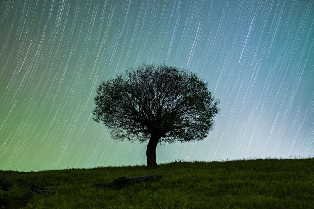 银河是格拉丹舒展的眉眼,晕染着宇宙的温柔;草原是星空停泊的归处,收容着星河的漂泊;孤树则是天地相契的注脚,默记每一次相逢的私语。快门定格的瞬间,皆是宇宙与大地的絮谈:草原的风掠过低矮枝丫,带着枯草干燥的气息,揉碎星影,落在龙胆花瓣上,花瓣一颤,抖落半颗夜露,坠在草叶上的声响,轻得像星子落在人间的叹息;星空的光漫过草甸,织就覆着萤光的锦缎,枯草末梢也镀上银芒。你站在这片光影里,所有的纷扰都被晚风吹散,只剩天地与自己,简单而纯粹。二者缠缠绕绕,旷野里竟藏着这样暖乎乎的秘境。每一寸寂静里,都是星河与草原相契的温柔,荒原不再荒芜,成了宇宙俯身与大地轻语的归所,也成了你暂别纷扰、与天地相拥的栖心之地。