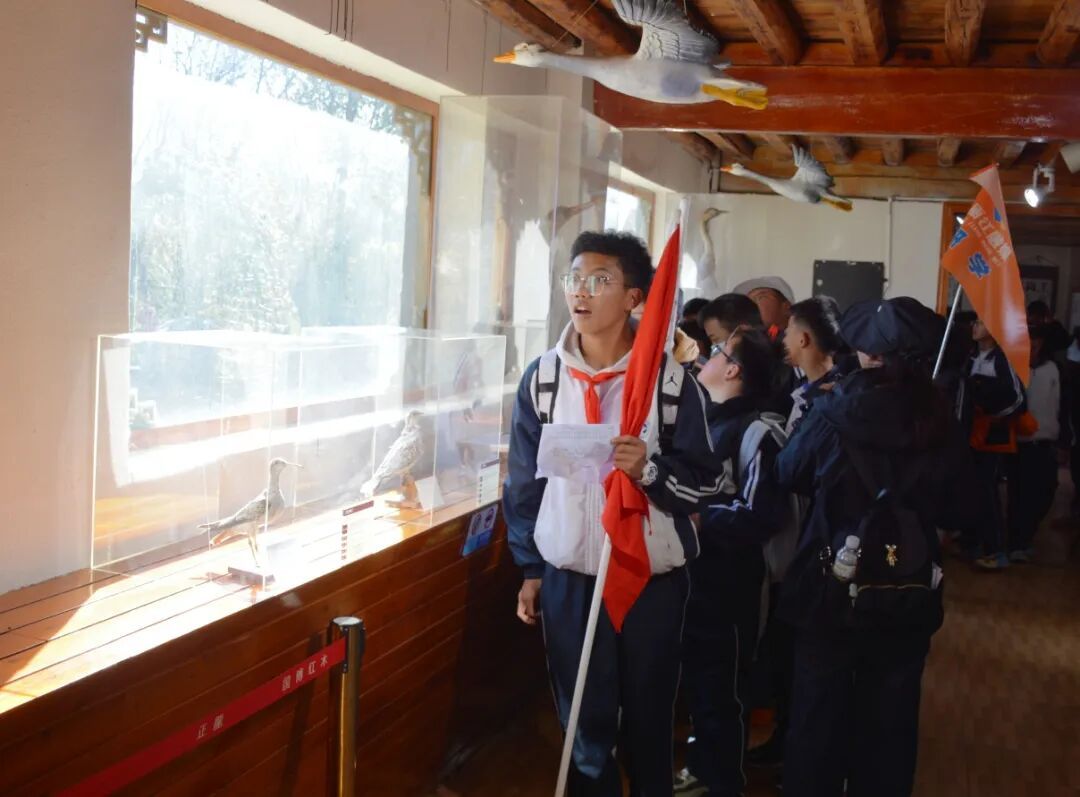 午餐休整后,研学队伍走进丽江拉市海湿地博物馆。通过标本展示、图文资料查阅及影像讲解,同学们系统了解候鸟迁徙路线、栖息环境及湿地生态保护现状,重点认识了黑颈鹤、灰鹤等珍稀鸟类,对拉市海在候鸟迁徙途中的“驿站”作用有了直观而深刻的认知。