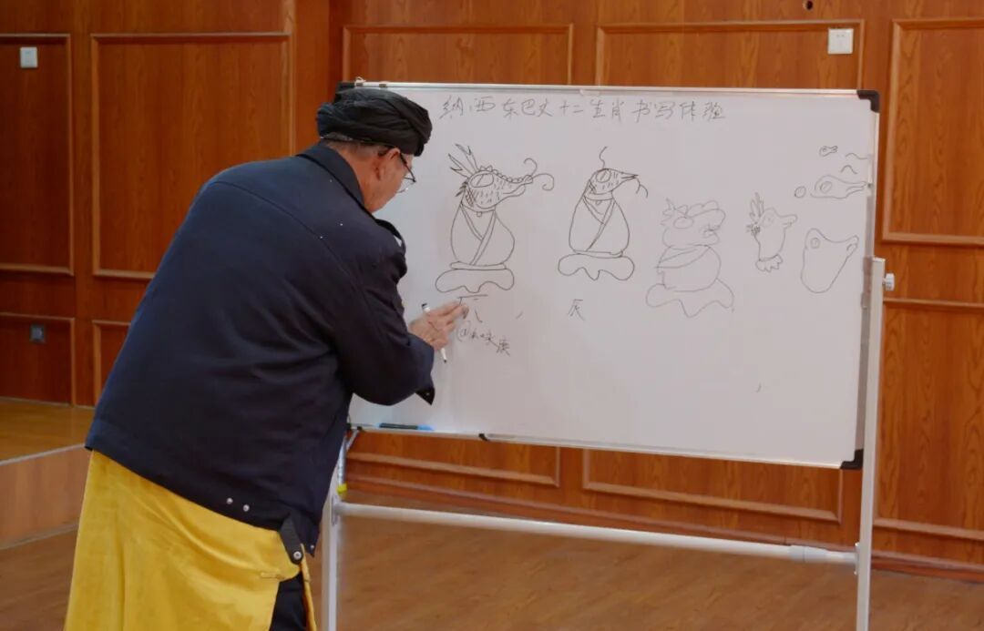 东巴老师教学生们书写东巴象形文字。记者 吕坤钊 摄