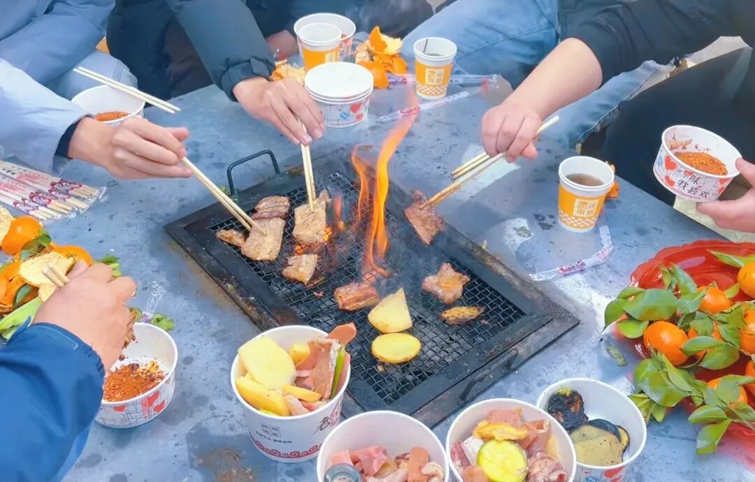 亲友邻里围坐在一起吃烧烤。记者 李耀瑭 摄