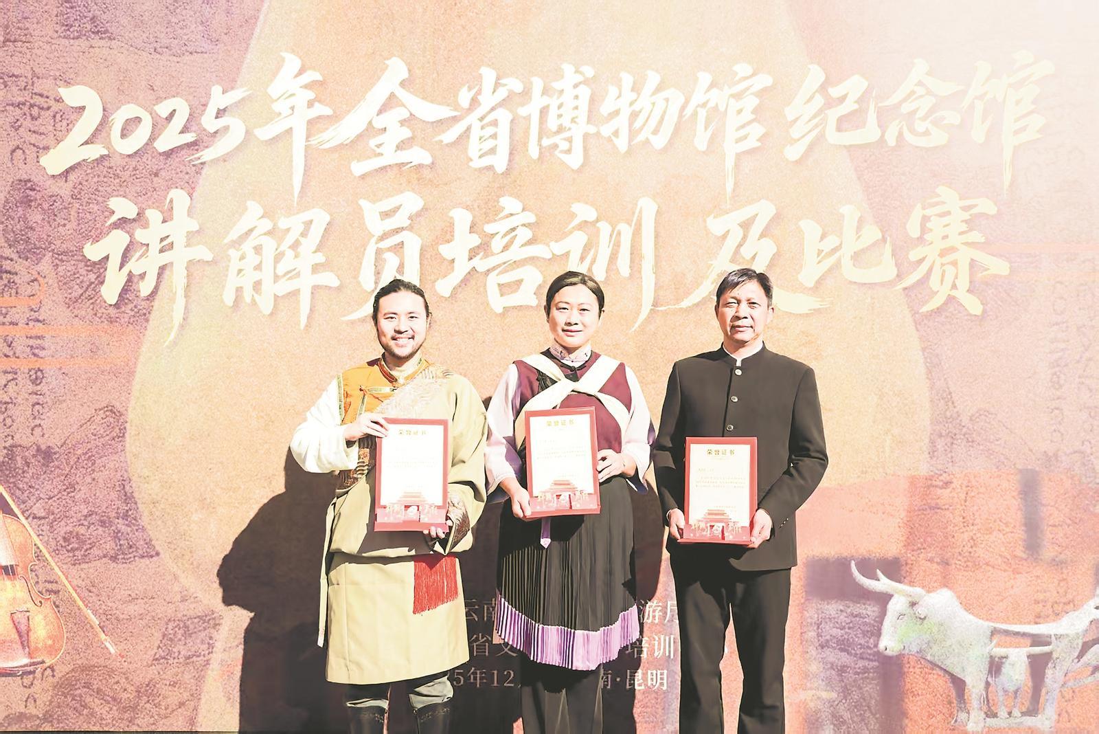 近日,“2025年云南省博物馆、纪念馆讲解员培训及比赛”在昆明落幕,来自全省16个州(市)及省直文博单位的100名选手参加比赛,丽江古道藏家博物馆讲解员周志衡斩获一等奖,丽江市博物院讲解员洪蕾、永胜边屯文化博物馆副馆长王建生荣获二等奖。