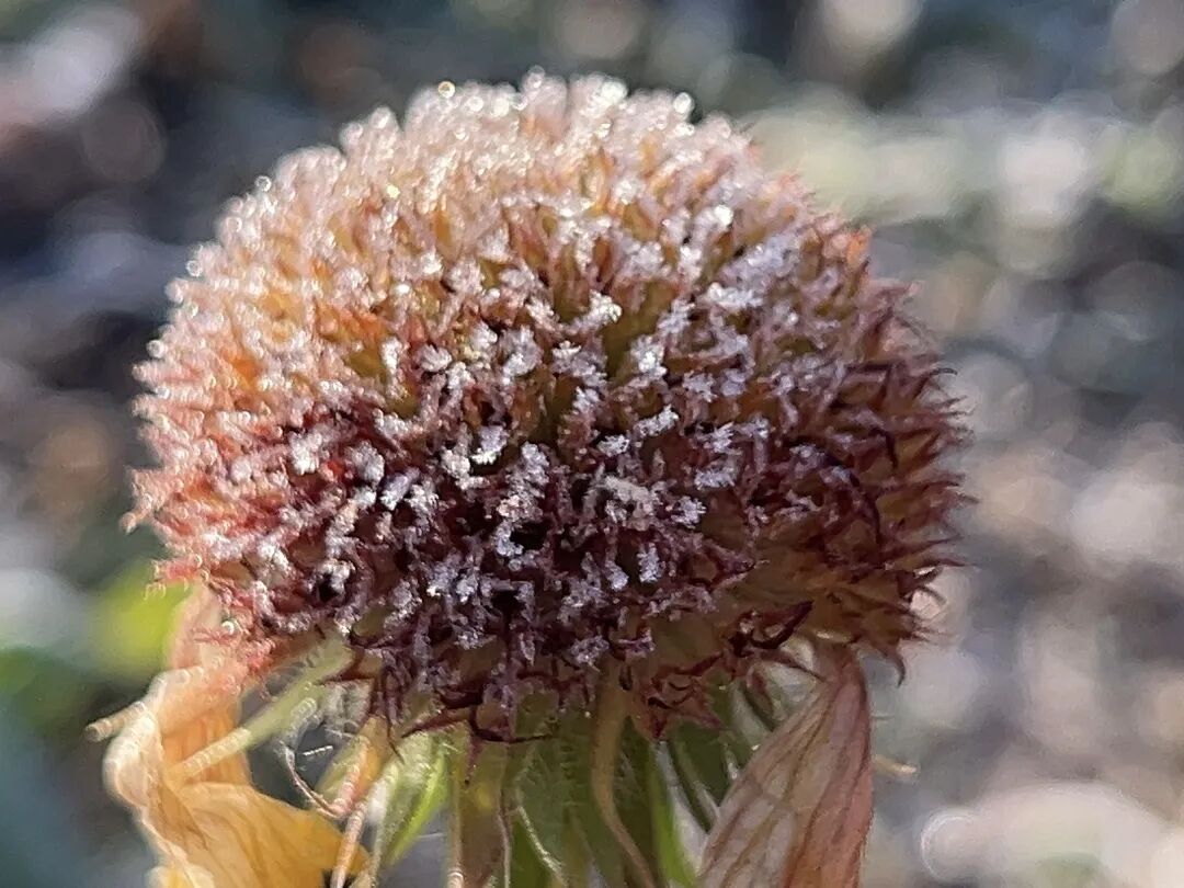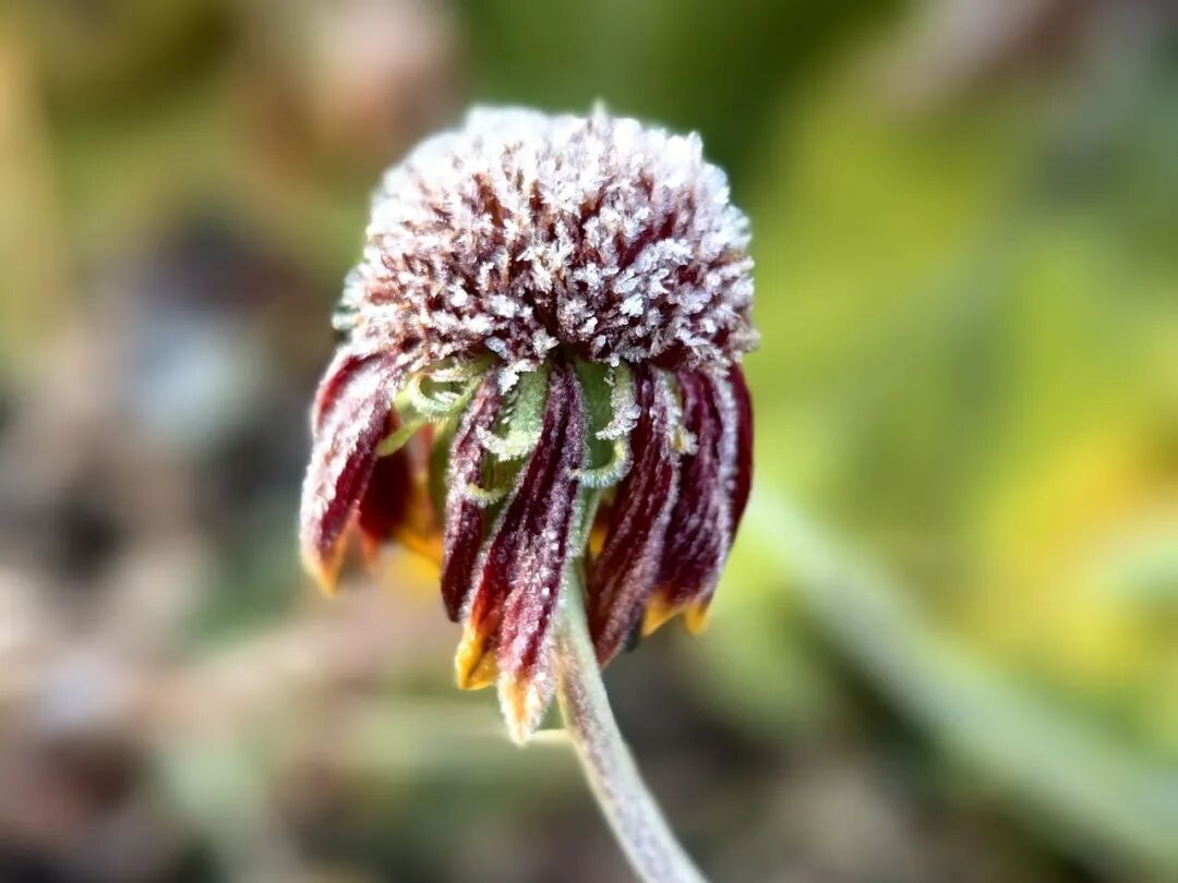 野蓟的紫苞被霜裹成乳白,针刺失去了锋芒,倒显出几分温柔。