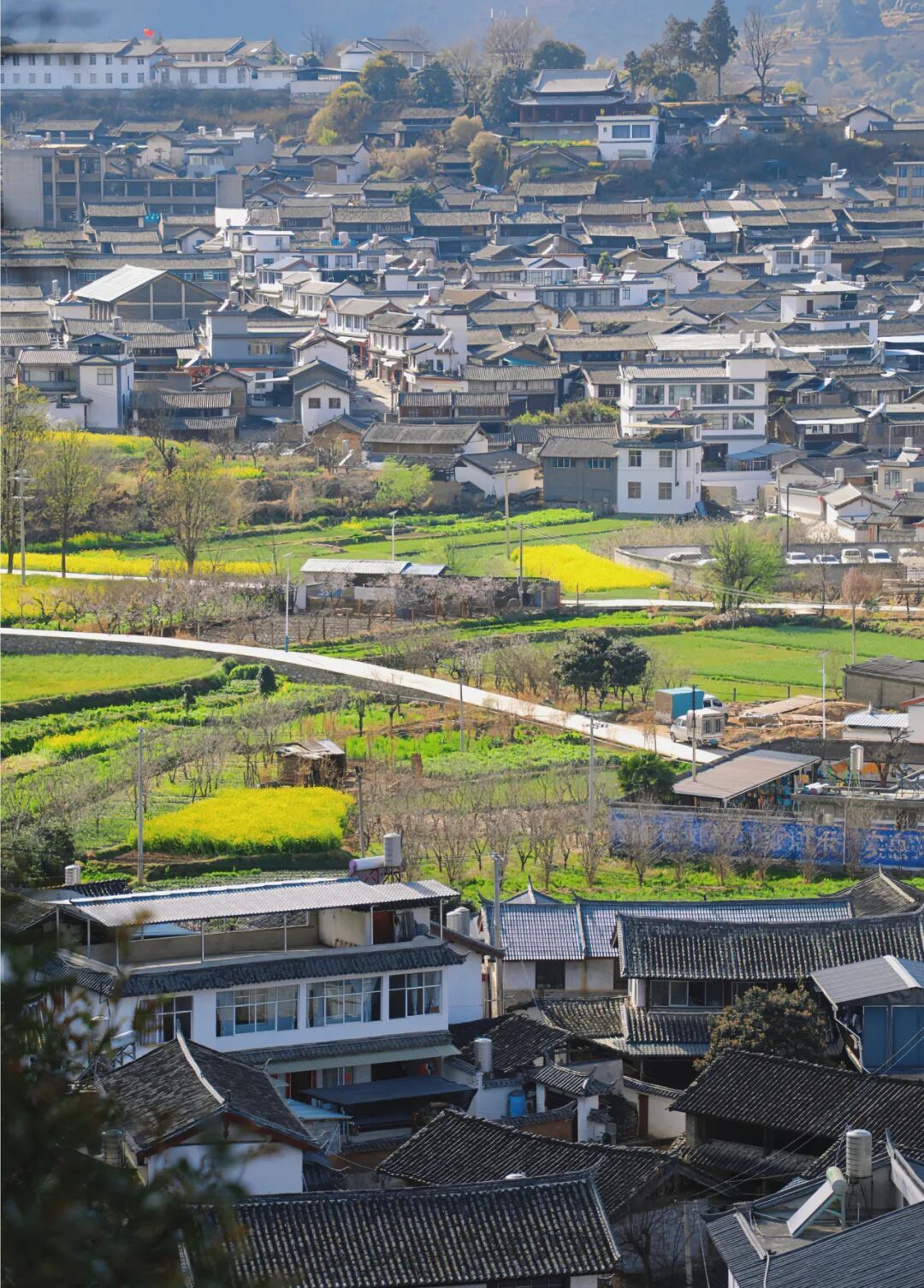 古镇依山势而建,房屋西一排、东一排,层层下落。站在街东或街北远望,房屋随山势层叠,与远山融为一体。更妙的是,家家户户房屋朝阳,互不遮挡,推开楼上窗户,江湾柳色与田野风光便扑面而来。