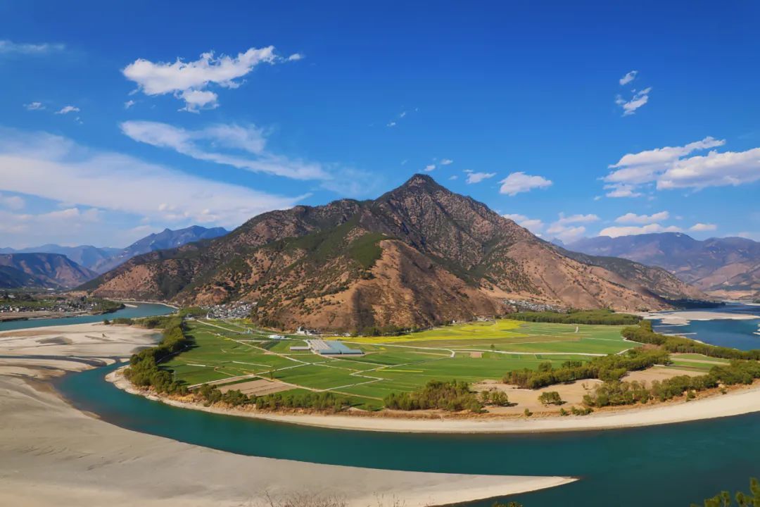 石鼓镇的“长江第一湾”是地理奇观,也是免费的人文驿站。奔腾的金沙江在此忽然变得温婉,碧波绕出百里沃野,与巍峨雪山、金色田园交织出一幅动静相宜的立体画卷。晨昏时分,霞光为江面鎏金;云起之时,雾气如哈达般缠绕山腰。来此静立远眺,可看江河壮阔,感受天地间永恒的力与美。