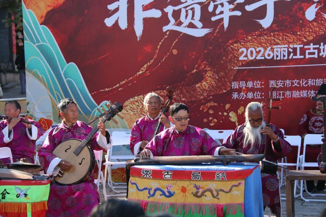 为了让更多人沉浸式感受古乐魅力,一场精心编排的“西安鼓乐与纳西古乐音乐会”也在四方街举行。西安鼓乐庄重恢弘,纳西古乐飘逸幽远,乐声吸引了众多游客、市民驻足。有人记录拍照,有人闭目沉浸。