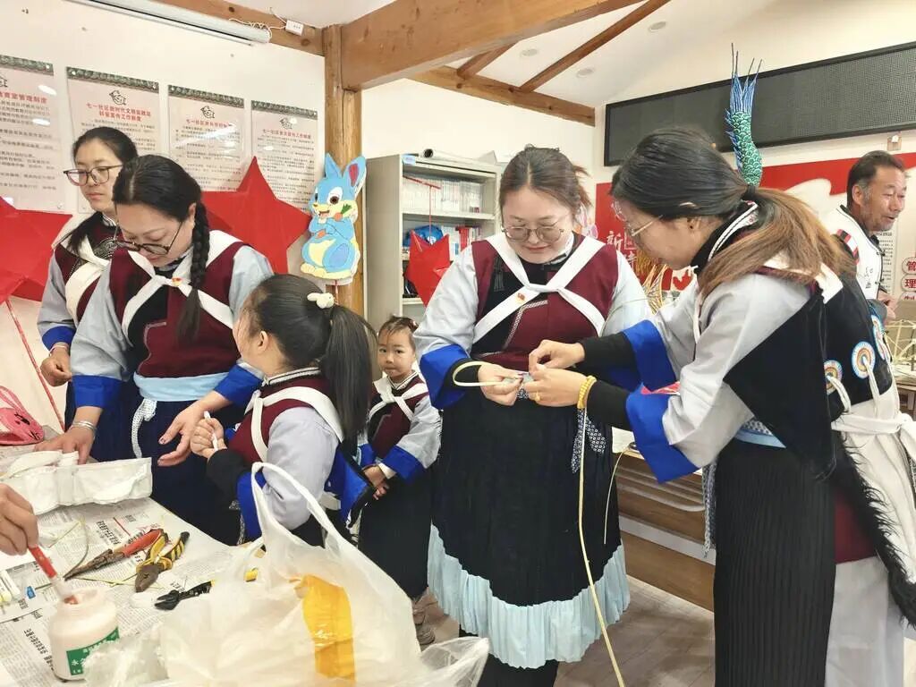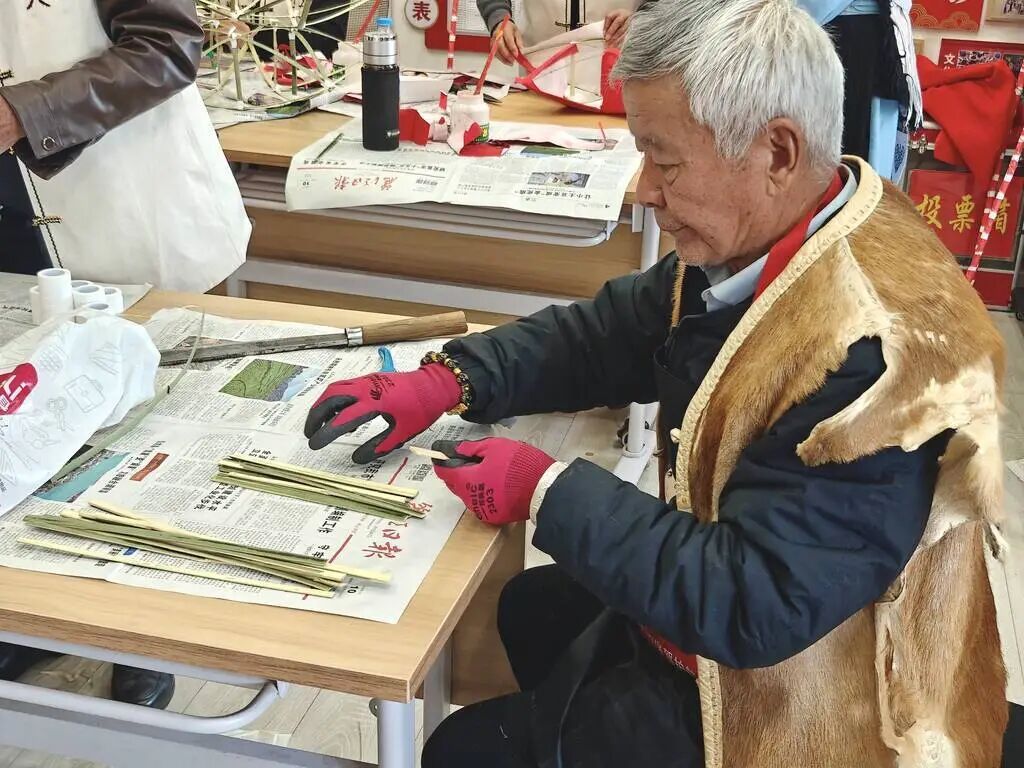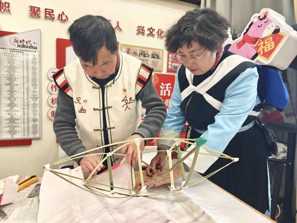 2月28日,在大研街道七一社区,十余位纳西族老艺人、社区居民与小朋友围坐在一起扎花灯,大家分工协作、其乐融融,忙碌且温馨。老艺人们手艺娴熟,手持竹篾,劈、削、折、扎一气呵成,指尖翻飞间,一个个规整的花灯框架便悄然成型;孩子们踮着脚尖,拿着彩纸、画笔,认真地粘贴、涂色,脸上满是欢喜;社区居民糊灯面、装提手,大家有说有笑,现场气氛热烈。