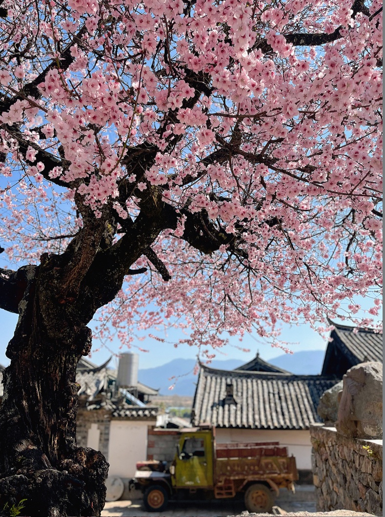 步入玉龙村,和煦的春风裹挟着淡淡花香扑面而来,村间巷道、房前屋后花影摇曳。村道蜿蜒,错落的纳西传统民居深处,一棵古桃树在暖阳下静静伫立。粗壮遒劲的枝干历经岁月洗礼,苍劲古朴;枝头之上,一簇簇桃花竞相绽放,粉白相间的花瓣泛着细腻柔光,微风轻拂,花枝摇曳生姿,与春风温柔相拥,尽显生机。