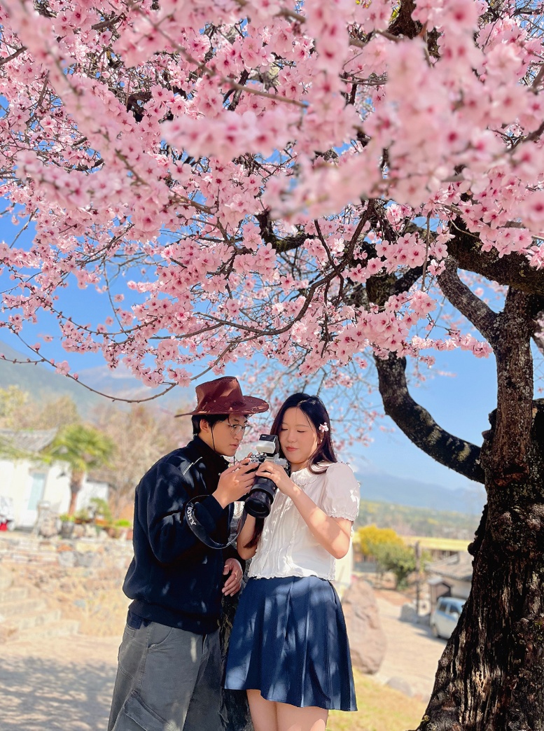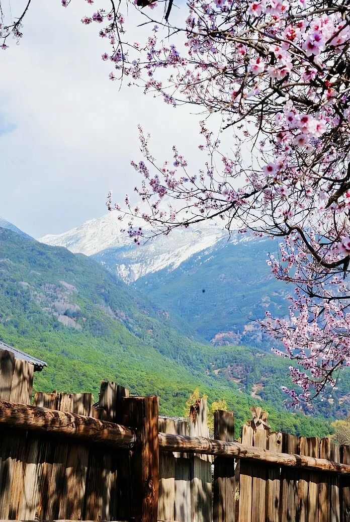 放眼远眺,玉龙雪山巍峨静立,银白雪峰与灼灼桃花、错落石砌民居、蜿蜒村道交相辉映,自然灵秀与人文厚重相融共生,勾勒出“雪山为幕、古村为台、繁花为景”的画卷。春花的柔美、古村的静谧、雪山的雄浑在此交织,村落宛若世外桃源,尽显丽江春日的生机与诗意。