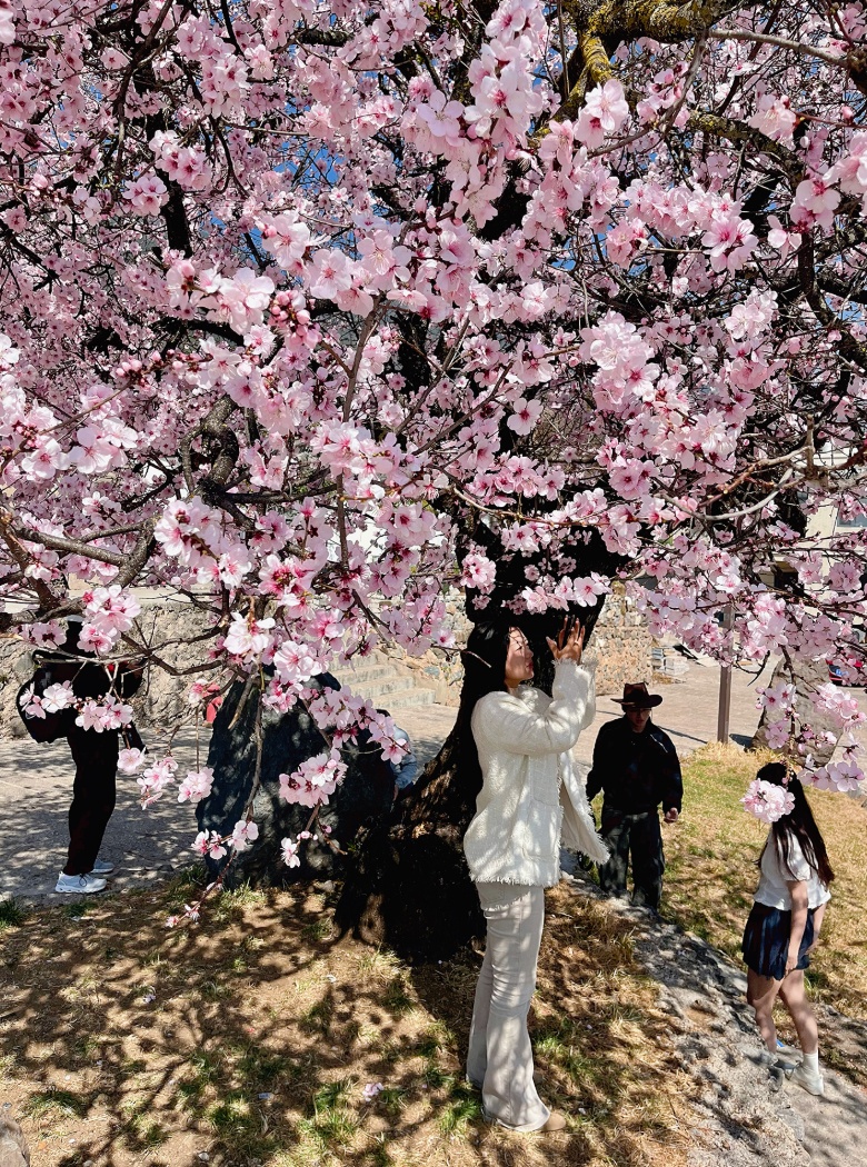 在桃树下拍照的游客。(丽江融媒记者 和慧芳 摄)