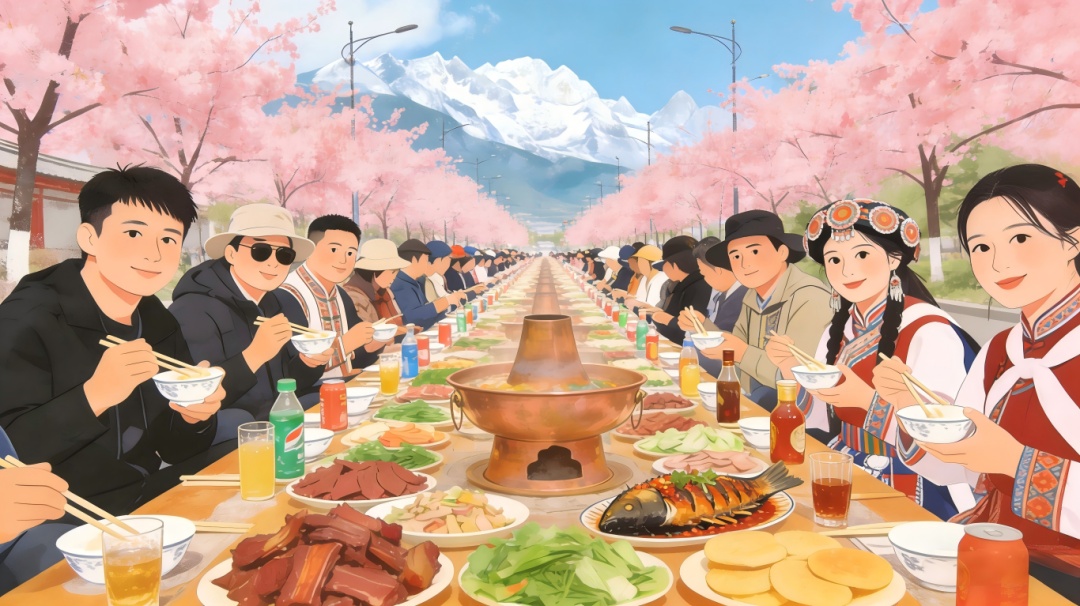 雪山脚下的樱花大道把春日浪漫拉满,这时候,三五好友相约着赴一场流传千年的“三多节”之约再合适不过!粉白樱花如云似霞,百余米长桌一字排开,从街头延伸到街尾……