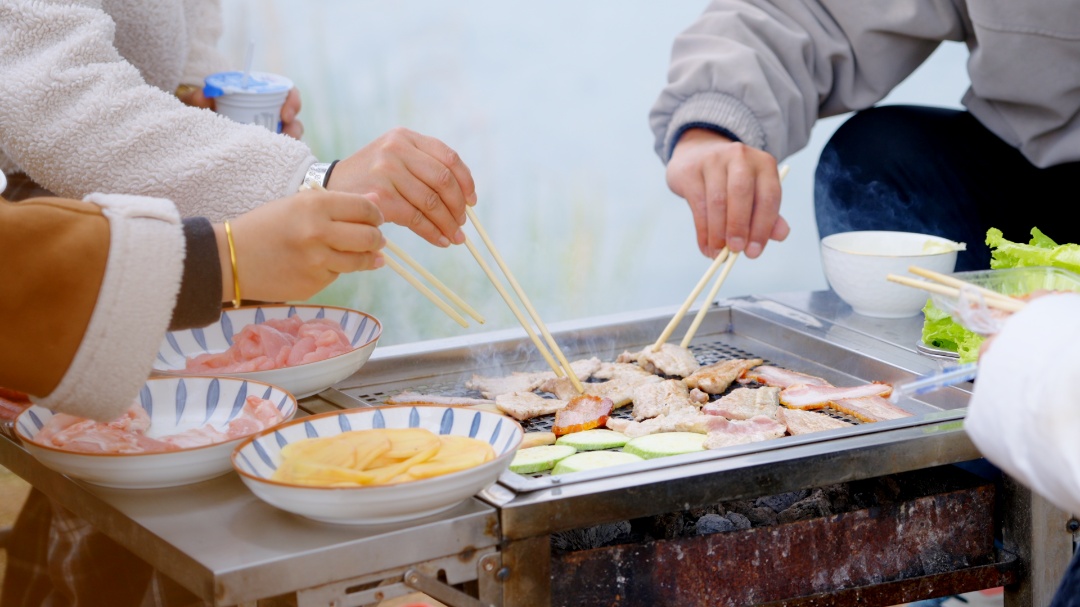 往草坪一坐,风一吹满是青草和湖水的清香。当烧烤桌上“滋滋”的声音响起,炭烤五花的香味也扑鼻而来,用生菜把裹满了蘸料的肉一口送进嘴里……这一刻的满足,绝了!