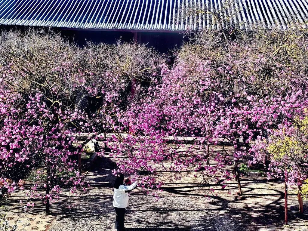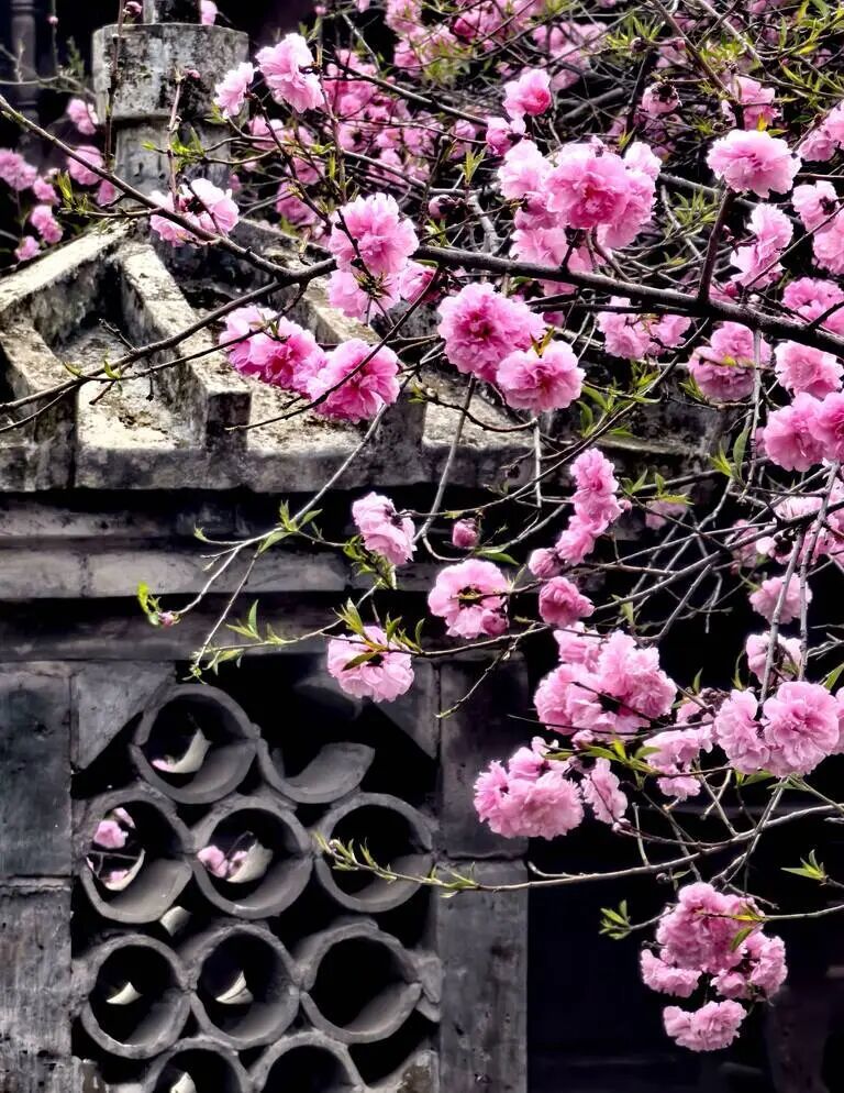 漫步院中,一步一景皆含诗韵:抬眼是粉云压檐,花瓣簌簌落肩头;低眉见青瓦承露,花影浅浅映石阶;转身遇壁画流韵,朱砂石青诉千年;触指是马帮遗物的岁月肌理,粗糙处藏着古道的坚韧。古建的厚重与繁花的柔美在此相融,历史的沧桑与春日的鲜活在此相拥,每一缕花香都裹挟着千年的故事,每一阵春风都传颂着马帮的传奇。