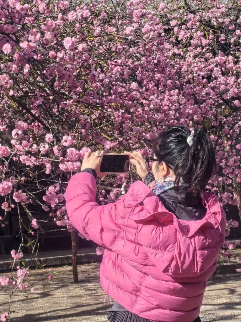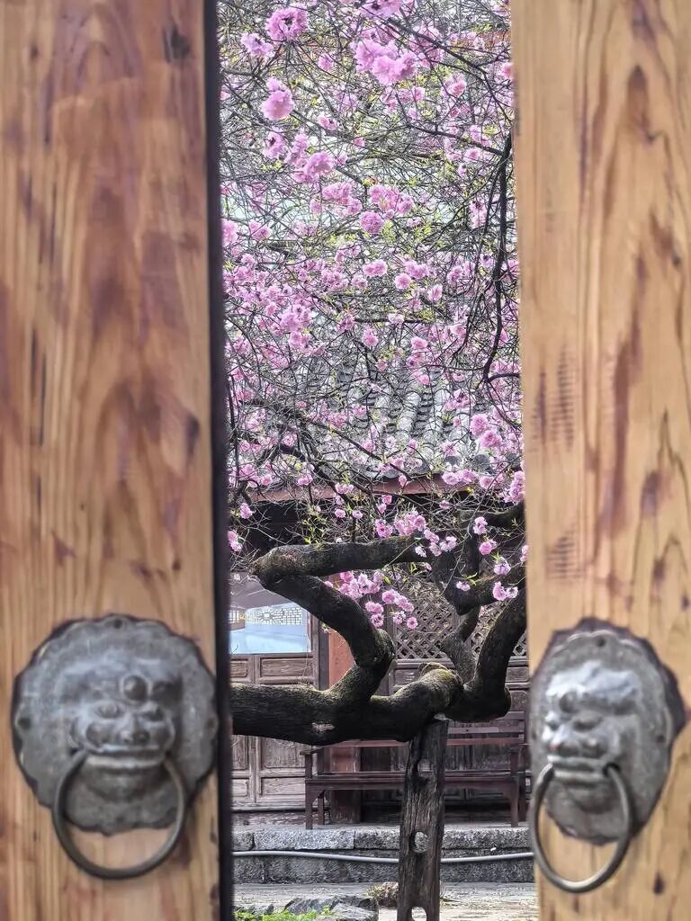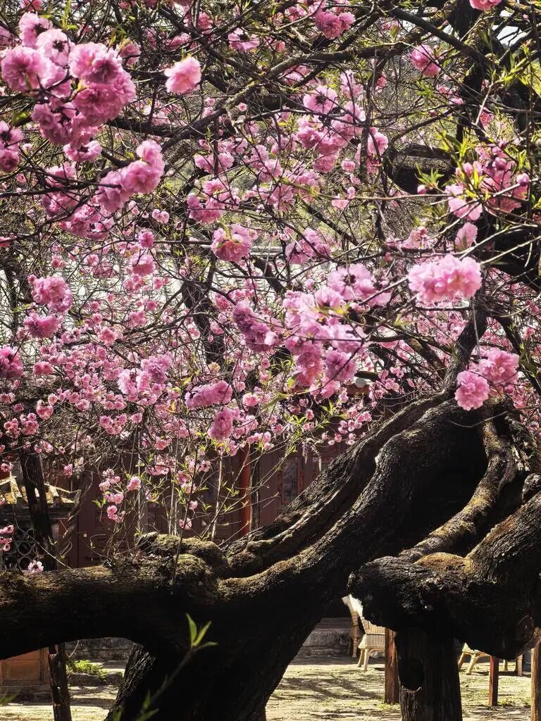 这株碧桃,见过马帮驮着茶盐踏碎晨霜,听过驼铃摇落边关晓月,亲历过古镇从喧嚣到沉静的岁月流转,却依旧年年如约盛放。它守着束河的文脉,也守着茶马古道的传奇,将千年风雨酿成枝头的烂漫,让沉寂的历史多了几分柔软的触感。