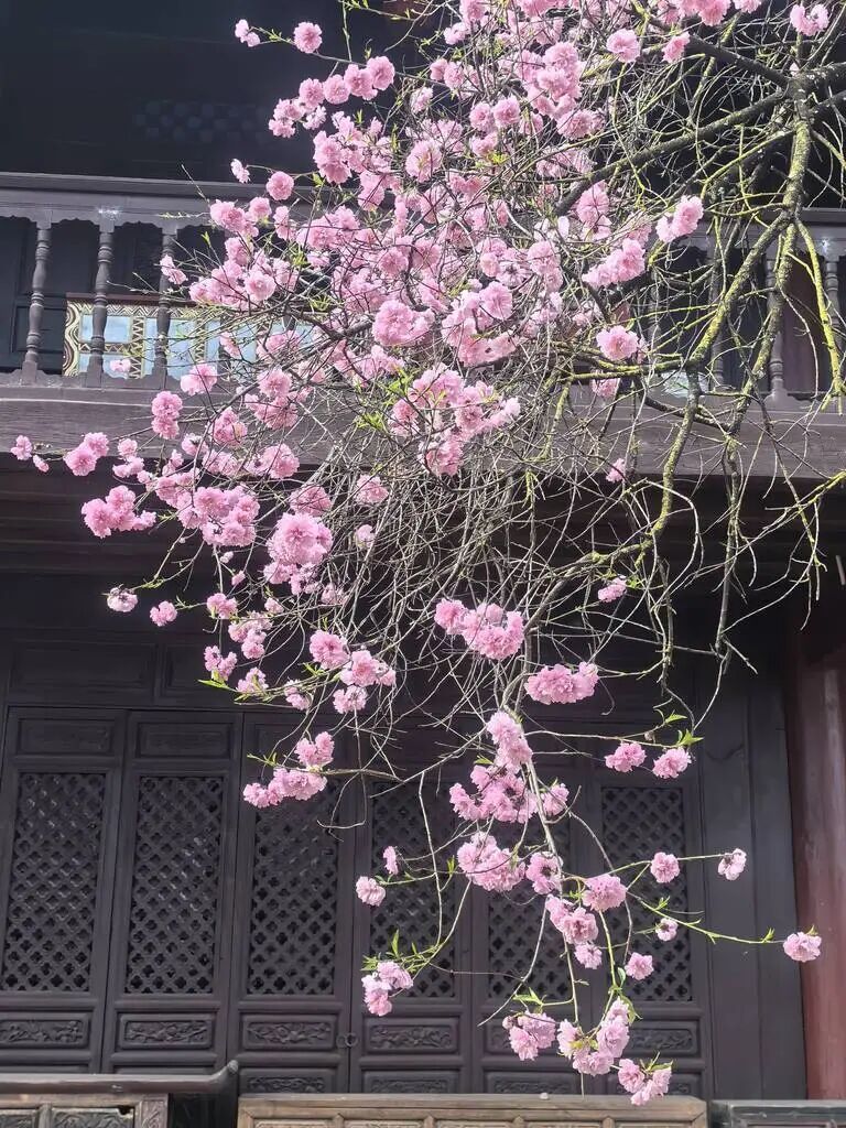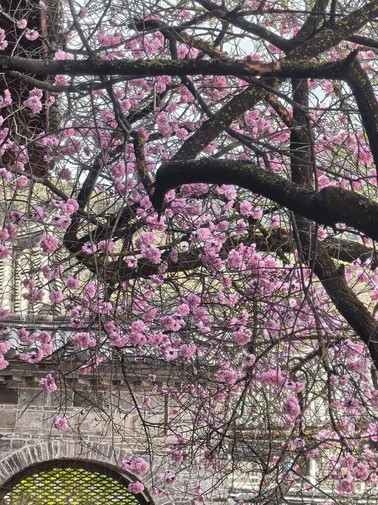 老枝虬曲如篆,皴裂的纹路恰似茶马古道的掌纹,层层叠叠的繁花缀在其间,与木氏土司古建的雕梁画栋相映成趣——朱红的梁柱衬着粉白,黛色的飞檐衔着云霞,将千年茶马的尘烟古韵,细细揉进这抹缱绻春光里。这座藏于束河腹地的院落,本是明代木氏土司“束河院”的遗存,大觉宫的明代壁画静立檐下,朱砂凝雪域之魂,石青染江南之秀,汉、藏、纳西等多民族的艺术神韵在色彩间流转,晕开岁月的温润。如今博物馆启门迎客,免费讲解的声线与花香缠绕,百年碧桃便成了最诗意的“笺纸”,邀世人共赴千年之约。