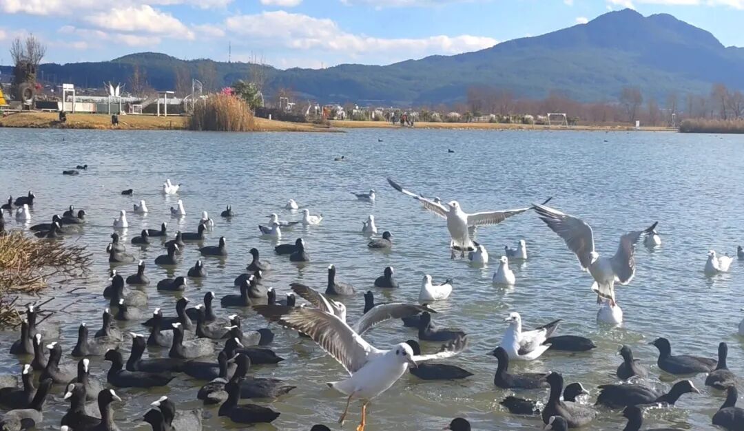 湛蓝晴空之下,澄澈湖水之畔,成群候鸟成为拉市海冬日里最灵动的主角。黑鹳、中华秋沙鸭、灰鹤等珍稀鸟类或在水面翩跹嬉戏,划出层层涟漪;或振翅翱翔天际,勾勒出灵动弧线;或结伴驻足滩涂,悠闲啄食觅食。灵动的身姿与蓝天、碧水、浅滩相映成趣,一幅生机盎然的生态画卷徐徐铺展。岸边,游客们或举着相机、手机定格精彩瞬间,或沿生态步道缓步而行,轻声交流着观鸟心得,在不打扰候鸟栖息的前提下,尽情沉醉于这份冬日限定的自然之美。