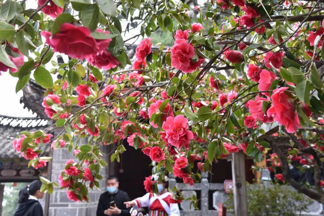 春日的丽江,处处是盛景。玉峰寺的万朵山茶恰逢盛花期,历经五百年的古茶树花开满枝,红蕊映雪,如云似霞,纳西人围坐在万朵山茶附近,赏花、对歌、闲谈,赏花瓣向阳绽放,听鸟鸣婉转悠扬,在花香中感受春的馈赠。普济寺的百年樱花粉里透红,老树枝丫盖满庭院,老枝与樱花相伴,述说着铜瓦殿古寺的百年过往,丽江的春日在这里有了不一样的韵味,浸润身心。